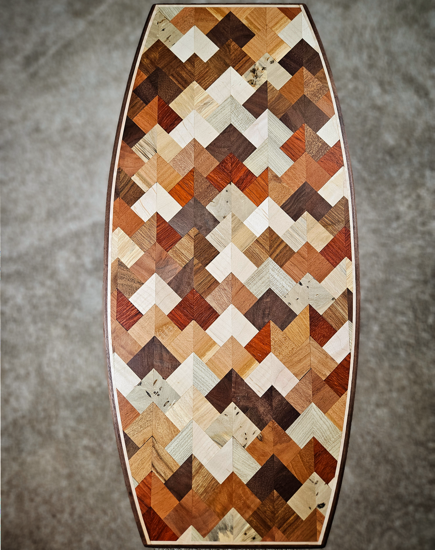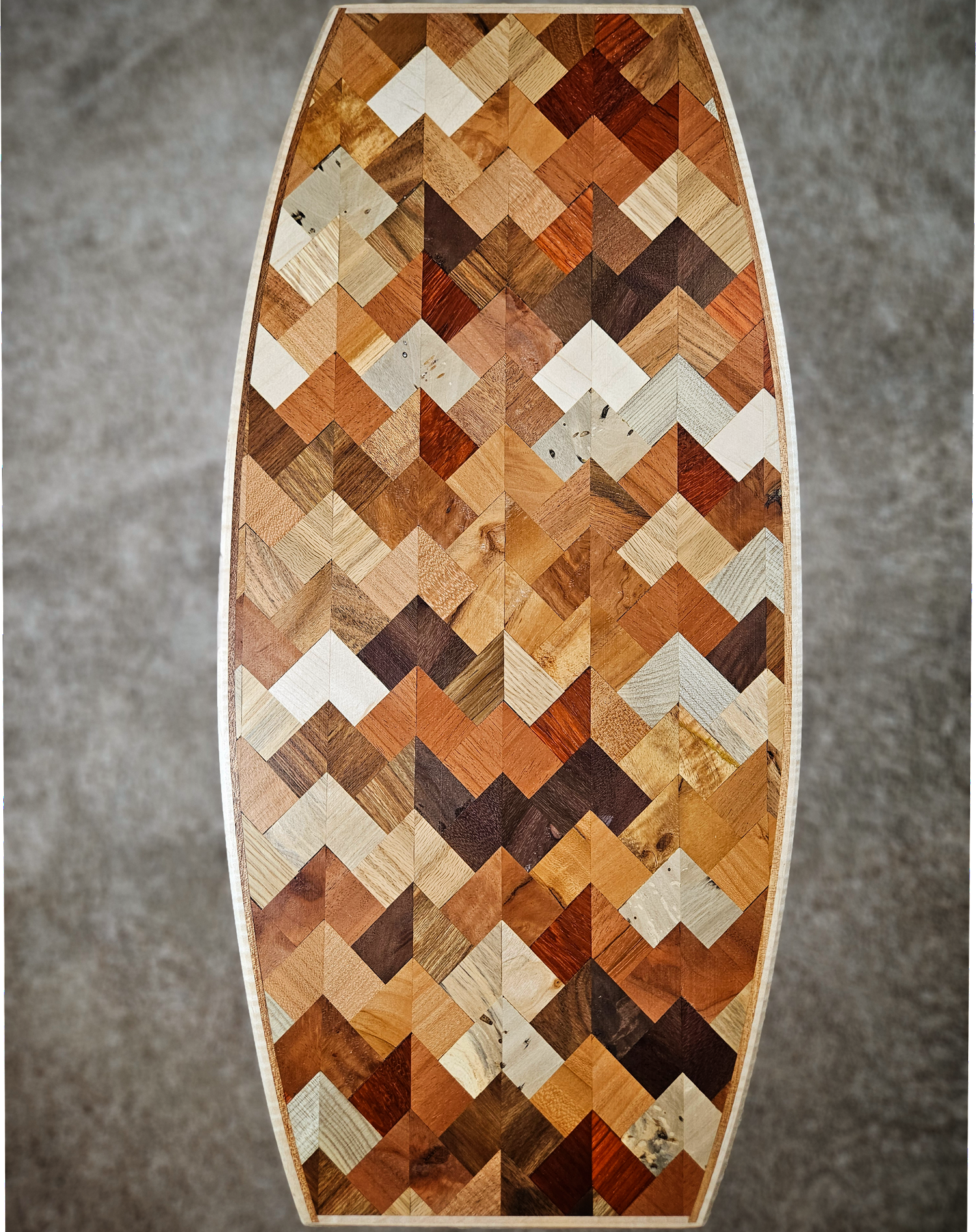One of the themes of my work is the complexity that lies beneath beauty. Taken as a whole I think this is a very handsome piece. Each tile viewed individually also has its own story. The way the grain moves. The experiences you can see in the grain such as the start of decay, the affections of beetles eating through it, wood used in other applications like whiskey barrels, and wood that has changed because of where it grew. Even the way each piece reflects and refracts light is different. Yet when all the variations in appearance and experience are brought together its togetherness yields a singular identity.