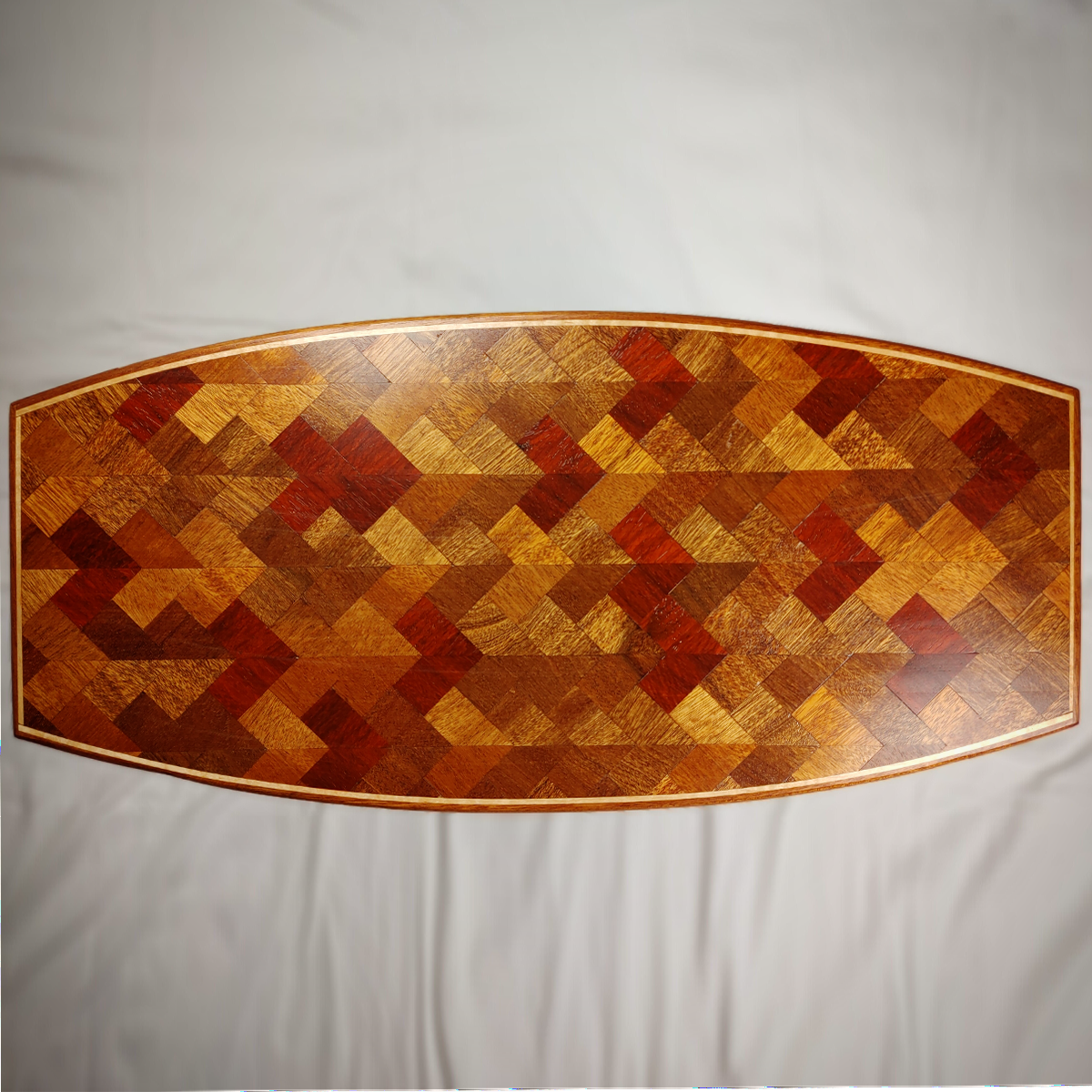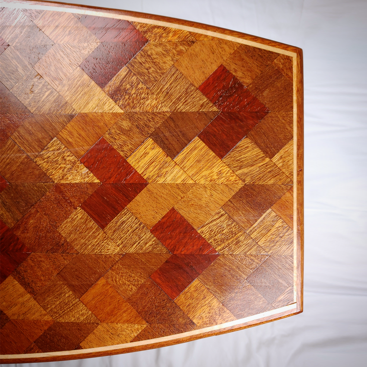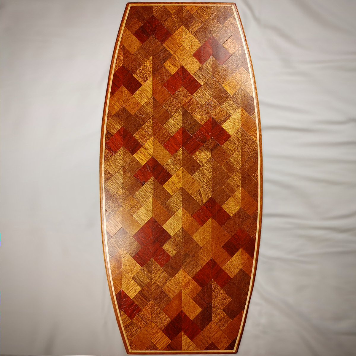 The original concept of this board, knowing how well African Mahogany plays with light, was to create a lustrous "fish scales" pattern to complement the shape of the board and appeal to his culinary preferences. The Padauk (darker orange) tiles are mixed in randomly to give it an organic feel.