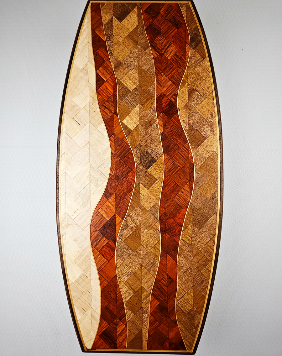 There are three levels of viewing for this piece. From across the room it's crispy bacon with burnt edges. Closer, maybe looking at it from across the table you'll see the heirloom scales. I'm really enjoying designing with the heirloom scale pattern and this is an experimental learning piece. I'm incorporating two construction themes to see how they play together and learn from the experience of pairing the two. Once the board makes it your way, looking close-up you'll see my attempt to keep the lines of every tile continuous between the divisions of the different woods. My intent was to keep the lines of those tiles continuous to act as a cohesive element between the different colors.